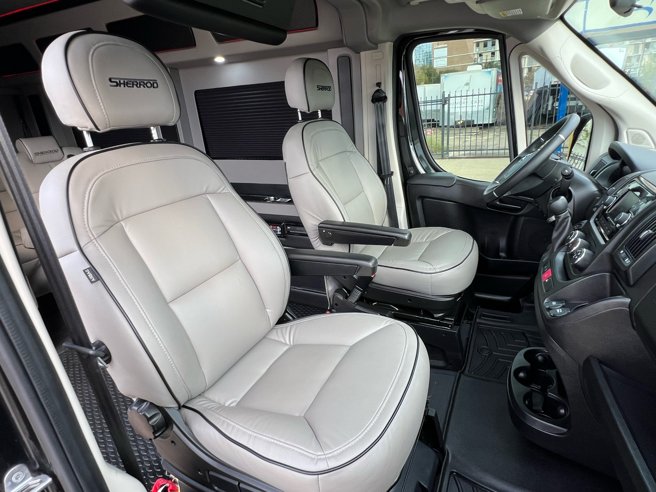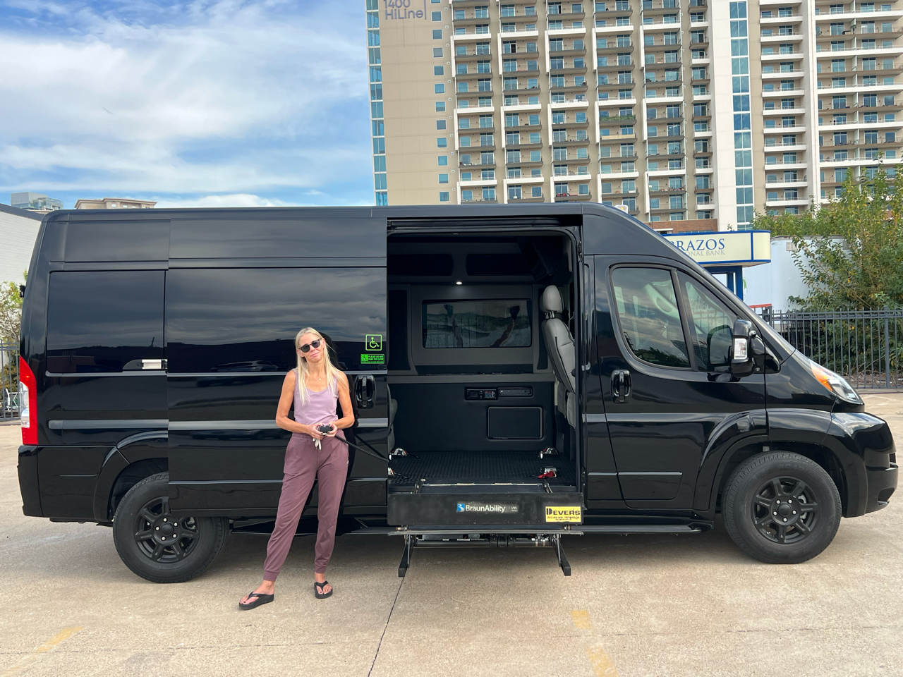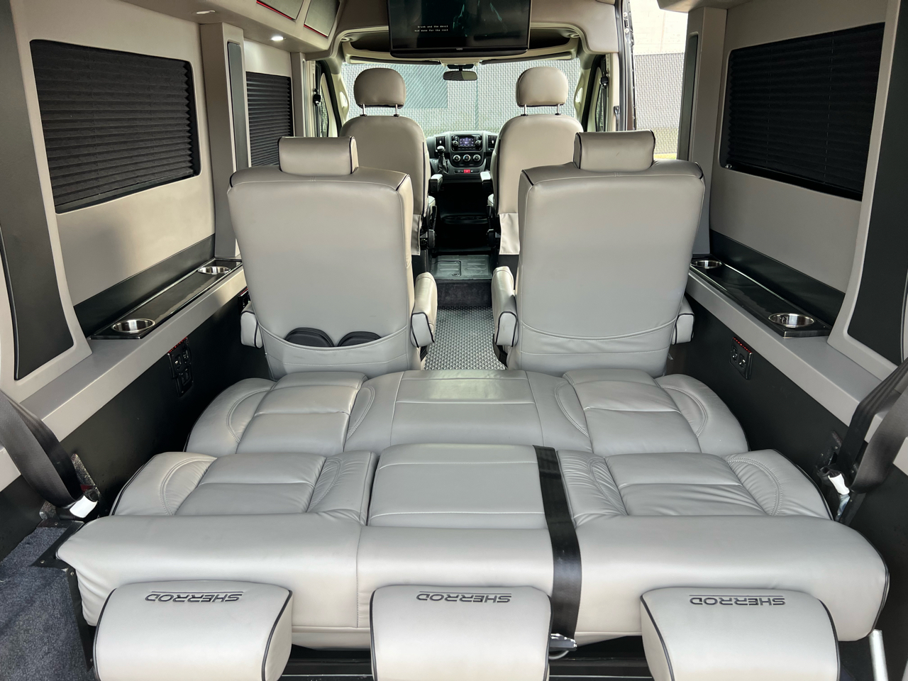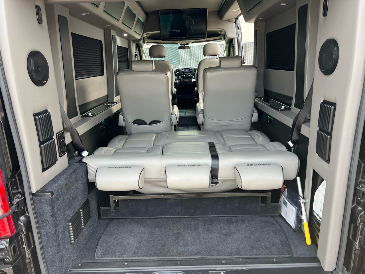 Welcome to Conversion Van Headquarters out of Dallas Texas. This is our super nice 2020 Ram Promaster 2500 Chassis on a 159 inch wheelbase. It has 2 conversions. It was converted by Sherrod out of Georgia and also has a mobility conversion done. The mobility is a super space saver because the handicapped lift stows underneath the van when not in use! It’s made by BraunAbility and is called a UVL lift which stands for under vehicle lift. The van has a hard surface for the wheelchair occupant to easily maneuver the wheelchair around inside. Also has Surelok retractable ratchet style wheelchair securement on 4 corners as well as a shoulder seatbelt. This is the ultimate setup! This van has seating for 8 including the wheelchair occupant. Some of the list of options are 32-inch tv, blue ray player, blinds, separate and independent rear ac and heat from the front, led reading lights, fog lights, an array of color changing lights which can be done by a remote control, sofa that turns into a bed with a press of a button, cupholders are lit up. cell phone charging throughout, captain chairs with power recline that also swivel 360 degrees, navigation, back up camera, black custom wheels, body side painted moldings including bumpers and mirrors, heated front seats, kicker speakers and so much more!